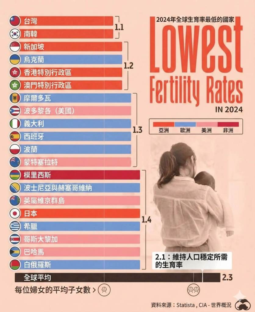 • 生育率吊車尾: 台灣目前的生育率僅約 0.8,與維持人口替換所需的 2.1 存在巨大鴻溝。這意味著在 15 到 49 歲的育齡期間,平均每位女性生不到一個孩子。
