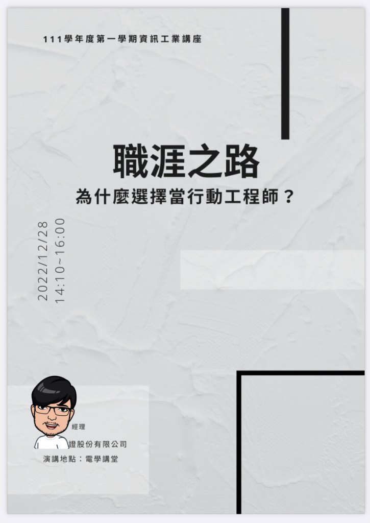 沒有思考太久,我便答應在中原資工當教授的阿宏,跟他簡單說明我十年的工作經歷,並選擇 12/28 週三這一天,前往中原大學給個演說,講題大方向是分享:我為何當行動工程師。