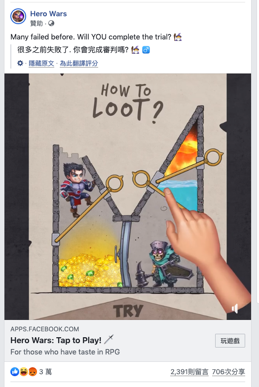 參考:國外開發者製作出 Hero Rescue,原汁原味呈現 FB 詐騙廣告的殺死地精遊戲內容。