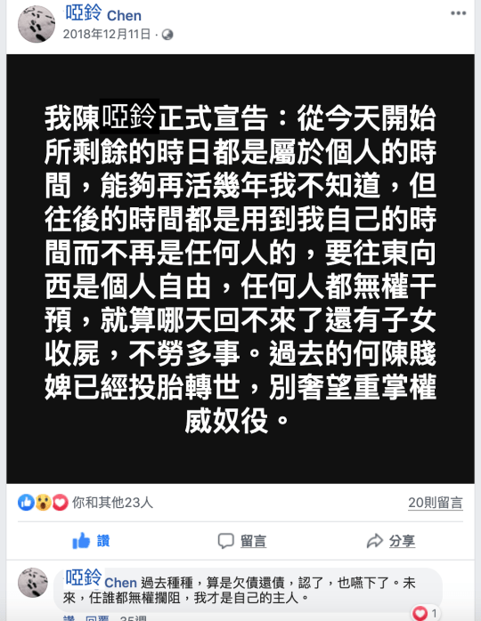 我陳啞鈴正式宣告:從今天開始所剩餘的時日都是屬於個人的時間,能夠再活幾年我不知道,但往後的時間都是用到我自己的時間而不再是任何人的,要往東向西是個人自由,任何人都無權干預,就算哪天回不來了還有子女收屍,不勞多事。過去的何陳賤婢已經投胎轉世,別奢望重掌權威奴役。