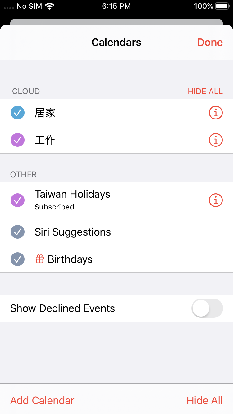 老實說,我沒在用內建的行事曆App,行事曆中的生日資料,是老早之前登入臉書帳號後,系統擷取回來加入。