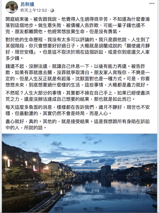 剛好那一個月看到呂秋遠律師的動態文章,是一位來不及落跑的公司負責人開庭後跟他說的話,在此我就張貼他的描述: