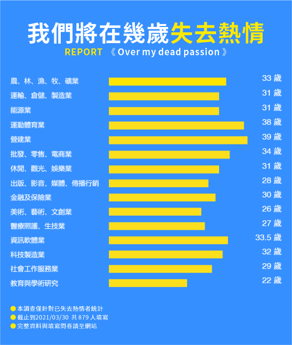 看到一張我們在幾歲對工作失去熱情,這是【失去熱情的人】所填寫,總共有 879 人填寫,或許值得參考?