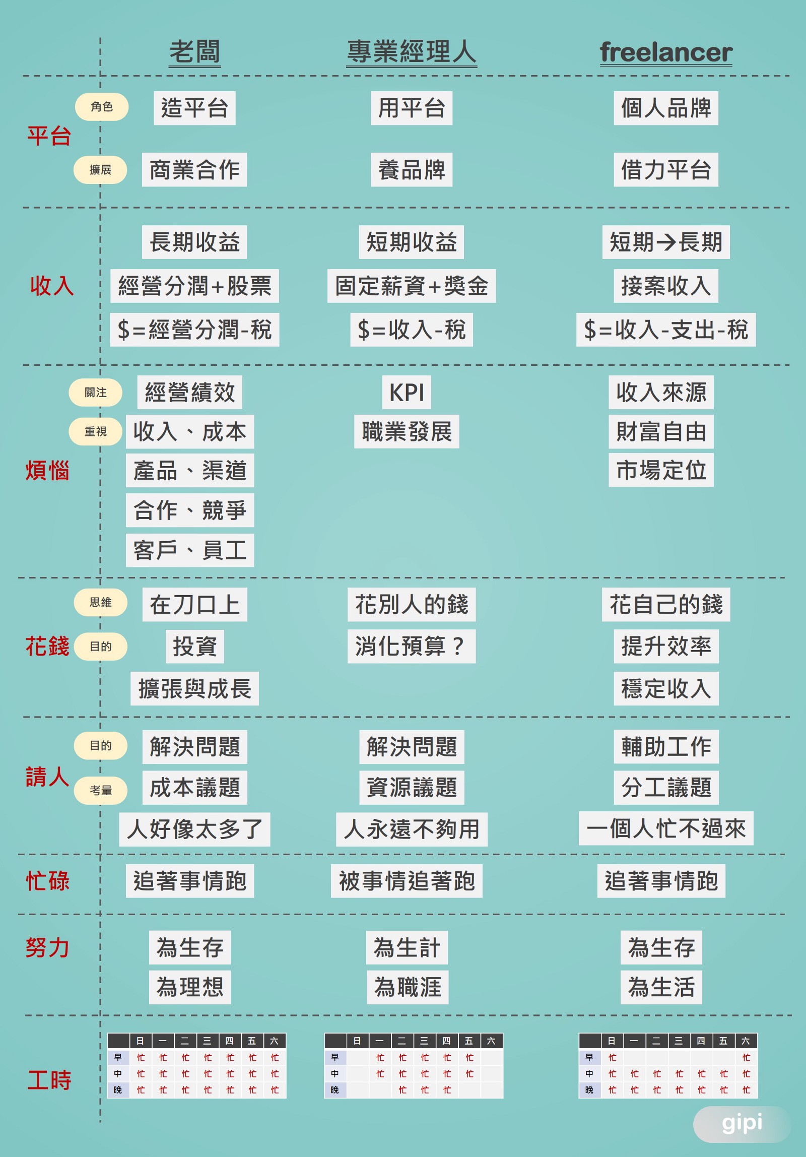 其實這張圖是在2018年10月被我看到,它是篇幅員廣大的文章,把老闆、專業經理人與freelancer的差異講得非常深入淺出,對於一個一輩子都在工作的人,想必能從中獲得些什麼,僅管可能一輩子都只是個「員工」。