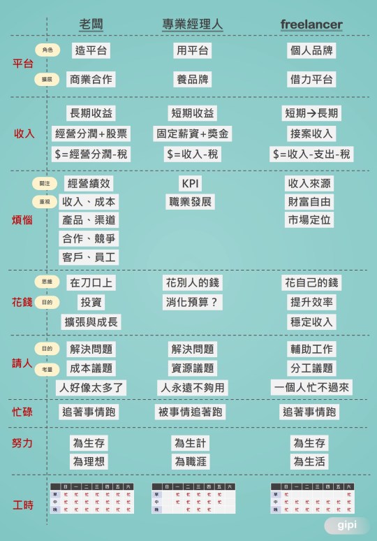 在資訊爆炸的網路時代,文字內容充斥在各種訊息管道,如FB和Line是台灣人最常使用的社群平台,這麼多文字訊息怎麼消化得完?此時就有賴組織能力非常優秀的網友幫我們整理成圖表。這次我發現圖解老闆、專業經理人與freelancer的差異非常具有參考價值,於是就張貼出來分享囉~
