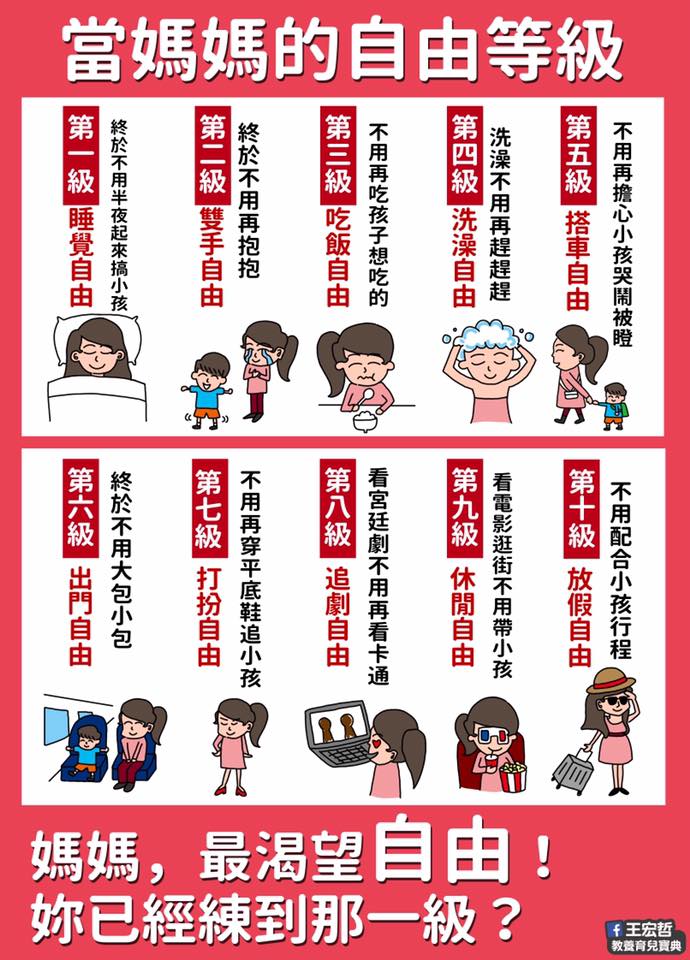 最近似乎很流行十個等級的繪圖,先前是看到圖解跑步中毒等級表,今晚看到圖解當媽媽的自由等級,會心一笑之外,想著自己也即將有寶寶,就順手存起來留念XD~