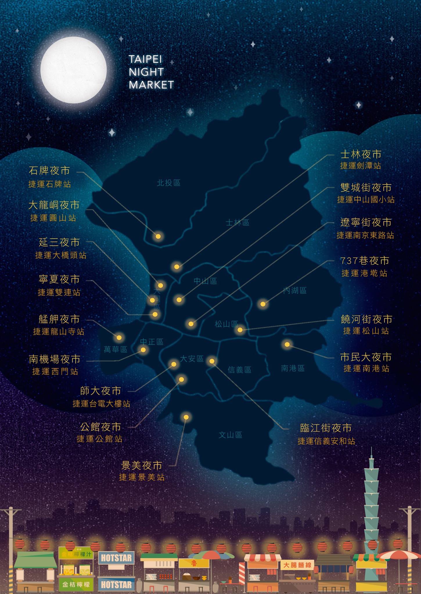 來貼篇只要是人,都會做的事情~吃。在粉專上看到台北捷運之夜市地圖 (Taipei MRT Night Market Map),心想有機會一定要吃遍這些夜市。😛