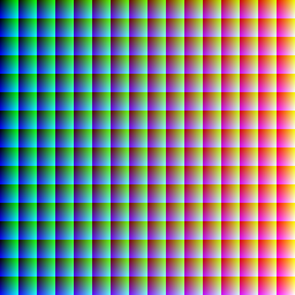 程式將會產生4096×4096PNG(無損壓縮格式)檔案(8.07MB),不過為了節省我寶貴的部落格空間,我將影像縮小並轉存為1024×1024JPG(有損壓縮格式)檔案(120KB)。有興趣的人就去跑我的程式來取得整個色彩空間圖吧:)~