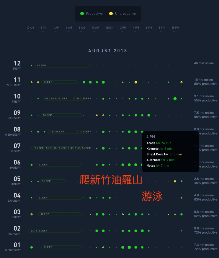 因為被臉書收購的Move App要「收攤」,我必須在2018年7月30日前備份我1206天的追蹤紀錄,讓我最近發現一個更好用且詳細的工具,是關於記錄人生歷程的平台Gyroscope (陀螺儀)。這個平台有Web、iOS App、Android App,還串接許多第三方來源的資料,比如:Apple Health、Instagram、Twitter、Fitbit、Strava、RescueTime等等。我發覺Gyroscope做得很符合我的需求,就將Move導出來的資料全數匯入Gyroscope。