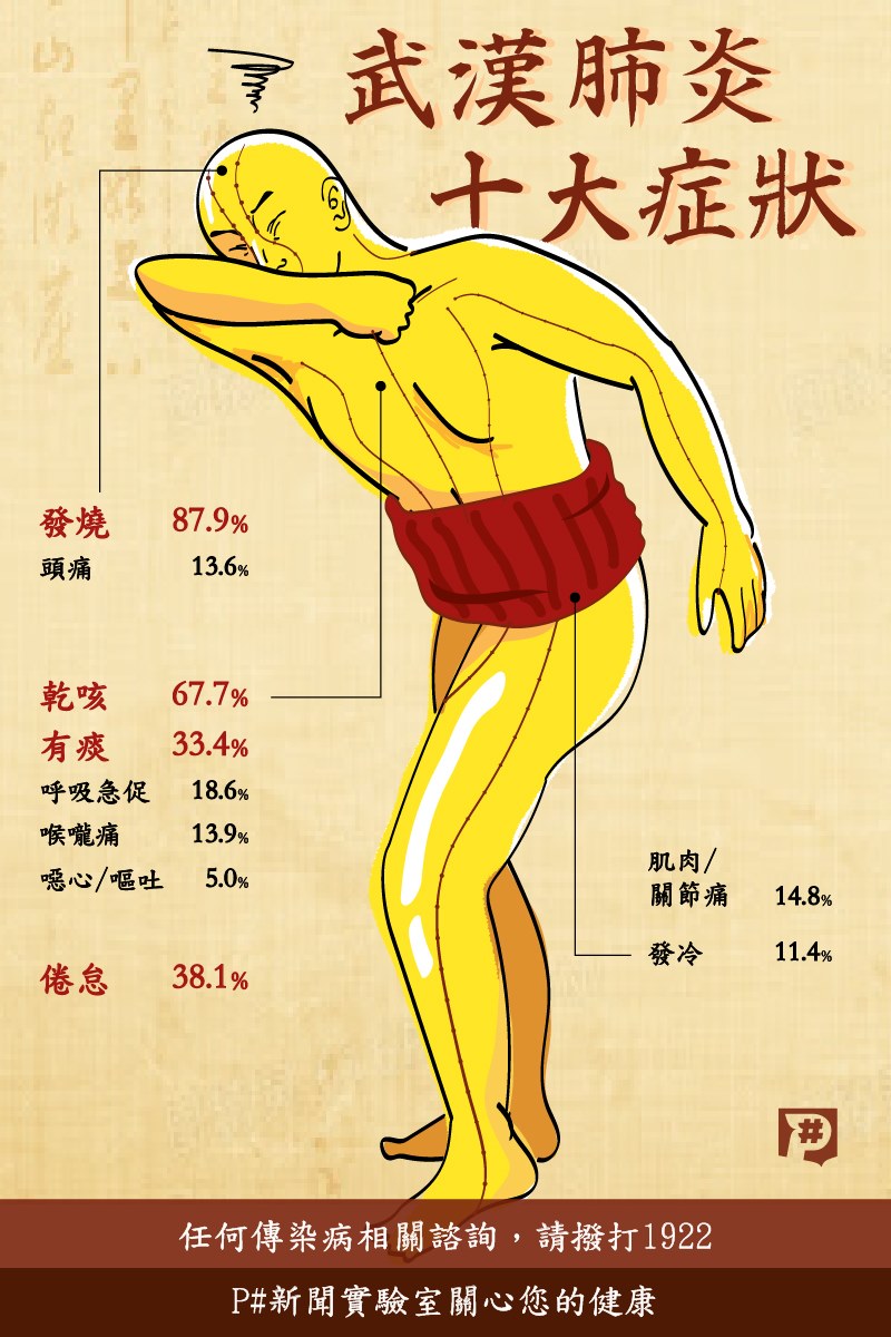 參考:武漢肺炎/ WHO公布確診患者10大典型症狀!發燒、乾咳、倦怠為前三名、世衛:武漢肺炎10大症狀 兩類人重症風險高。