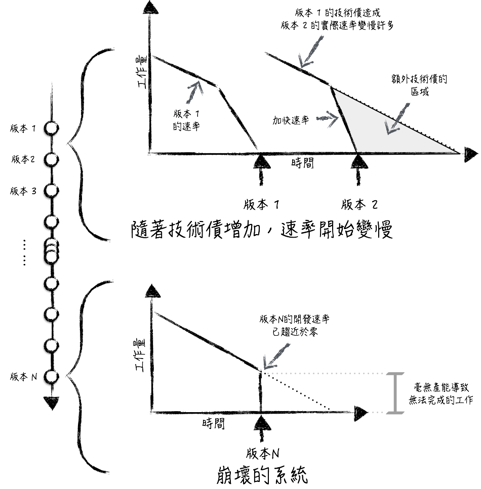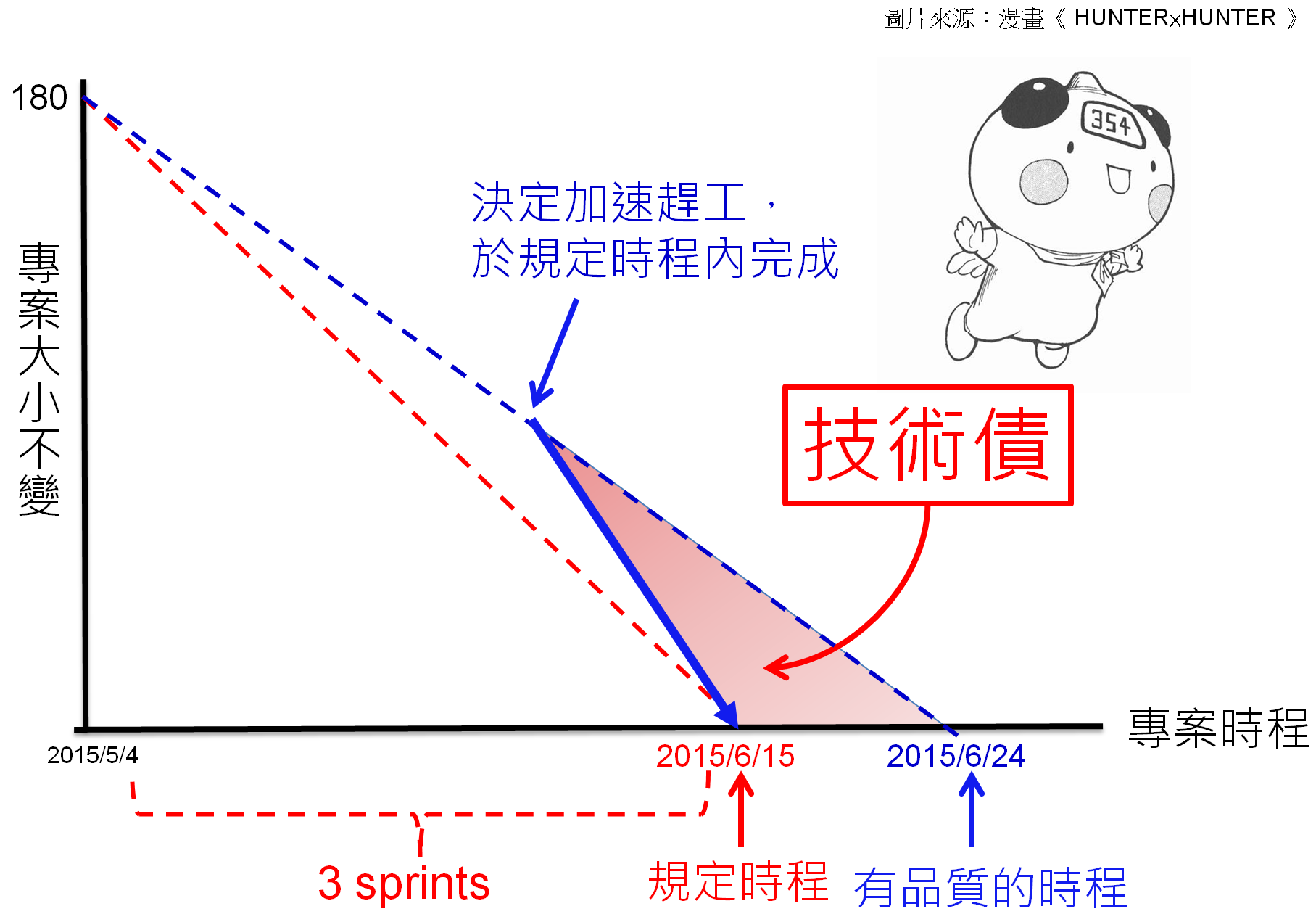 製圖的作者很神奇,使用我非常喜歡的動畫獵人,拿酷戮的念能力可以來做解釋,胖娃隨著時間債會越滾越大,最後破產就會讓敵人無法使用念能力。若拿來比喻軟體工程,技術債若隨著時間累積,到一定的程度使人難以再做增修,此時專案就要宣告「打掉重練」!